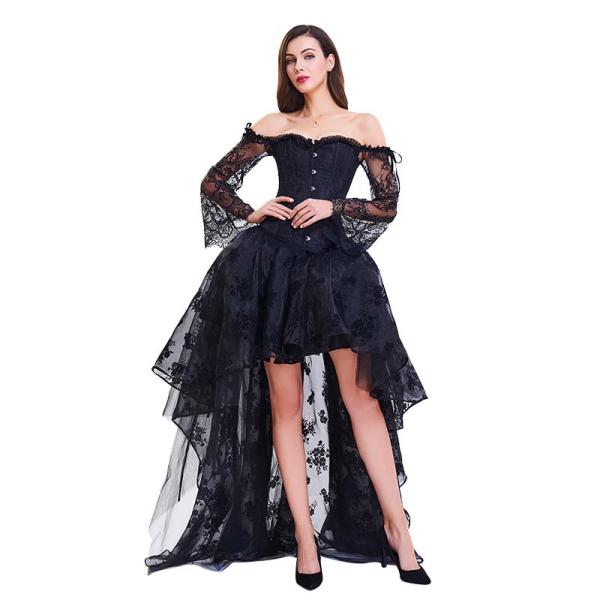 Steampunk elegant overbust corset featured with off shoulder design to show your beautiful shoulder and clavicle, fully overlayed with embroidery floral pattern, ruffled details, also match with charming long cuff floral lace sleeves. Busk closure at front, lace-up at back. It is suitable for steampunk-themed party, cosplay, Halloween party costume and night out show, or fashion show.